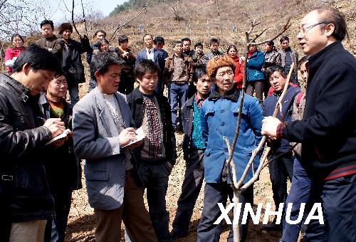 3月14日,西北农林科技大学教授魏安智(右一)在陕西省宁强县巴山镇向当地群众传授种植知识。