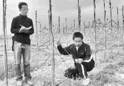 日前,西北农林科技大学在应届本科、硕士毕业生中招聘了35名学生,担任该校在陕西各地农村设立的永久性农业试验示范站的科研助理,聘期两年,既缓解了毕业生就业压力,又提供了积累自主创业经验的机会。图为该校园艺学院应届本科毕业生张伟宣(左)和杨国(右)在白水县苹果试验站观察苹果长势。