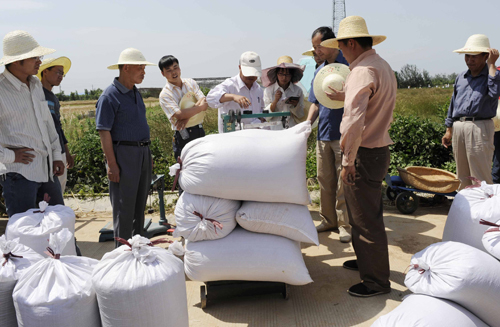 现场实收委员会专家正在对已收割的西杂五号小麦称产量