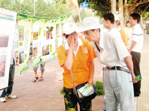 昨日,西北农林科技大学大学生绿色营的20多名学生来到宝鸡市渭河公园和火车站广场,开展保护渭河水资源宣传活动,学生们希望通过此举让广大群众都能爱护和保护渭河。 图为学生向市民进行宣传。 记者 孙秉志 摄