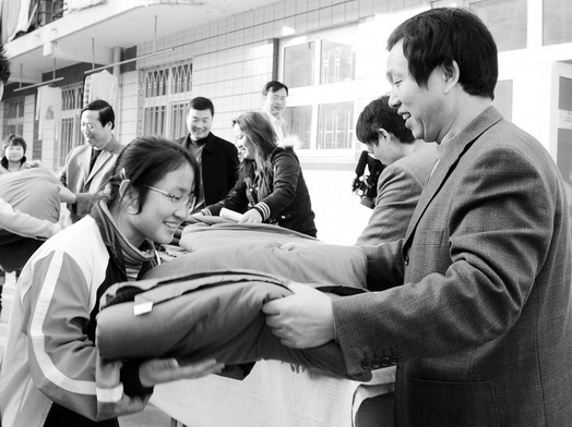近日,西北农林科技大学将一千多床棉被发放到家庭困难的学生手中。西北农林科大作为农业院校,来自农村贫困家庭的学生较多,时值寒冬,为确保每一名家庭贫困的学生都能温暖过冬、安心学习,学校通过招标方式为他们购买了棉被并及时发放。此外,学校还为一千多名衣物单薄的学生发放了补助金,用于购买御寒衣物。 图为学校领导为家庭贫困学生发放棉被。