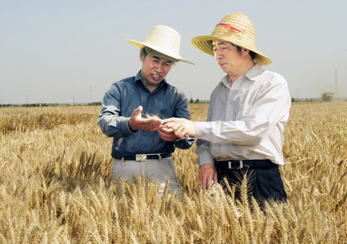 小麦育种专家张改生教授(左)与前来验收的专家在田间察看“西杂五号”的长势。
