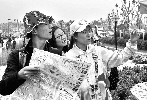 日前,西北农林科技大学500名大学生志愿者来到西安世界园艺博览会开展为期16天的志愿服务,为来自各地的游客提供服务,展现大学生的精神风貌。图为大学生志愿者在为游客介绍世园会的景点。