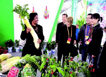在杨凌农高会的B馆大厅里,太白县提供展出的无公害蔬菜大萝卜,以它质嫩脆、个大等优势,引起了外国友人极大兴趣