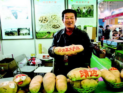 在第十八届杨凌农高会上,一位来自陕北靖边县的土豆种植专业户张永树拿着自产的超大土豆(马铃薯),向前来参观的群众介绍“小土豆、大产业”的经验