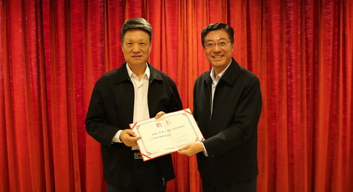 校长孙其信(右)为西部发展研究院院长陈宗兴(左)颁发聘书