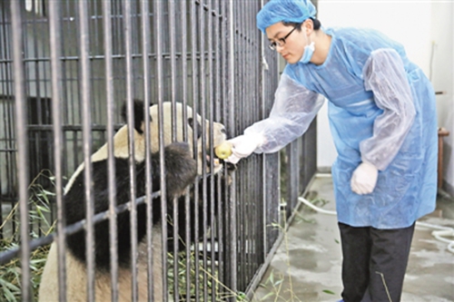 大学生志愿者在给大熊猫喂苹果 靳军/摄