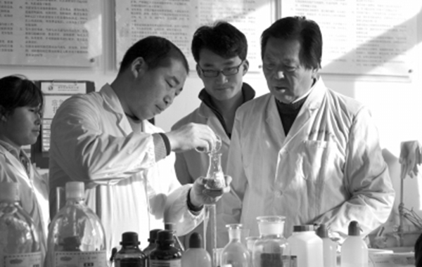 王辉教授(右一)与研究生在实验室工作。靳军摄