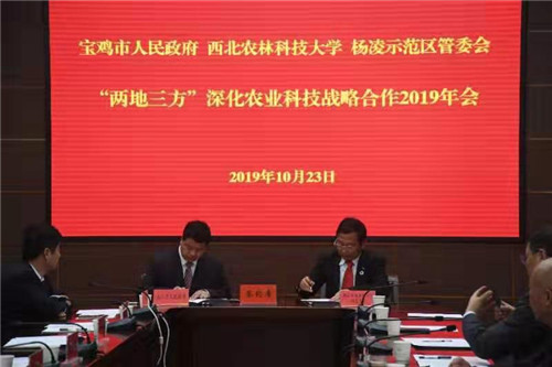 10月23日上午,宝鸡市人民政府、西北农林科技大学、杨凌示范区管委会“两地三方”深化农业科技战略合作2019年会在西北农林科技大学国际交流中心召开,会议就深化两地三方农业科技合作,加快区域现代农业发展进行了深入研究部署。