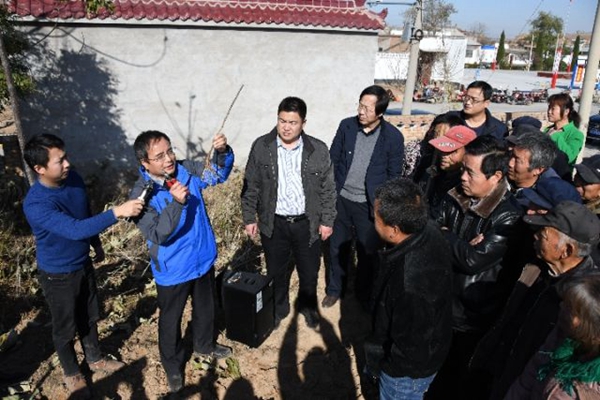 西农大教授杨涂熙向合阳县和家庄镇五丰社区村民现场演示教学冬季花椒树的栽种方法。