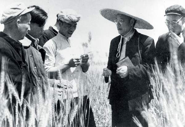 1958 年,康迪(右二)与劳动模范王保京(左三)在咸阳烽火生产大队田间