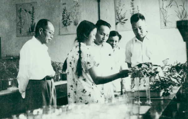 20 世纪60 年代,康迪(左一)陪同国家科委主任范长江(左三)参观农学系实验室