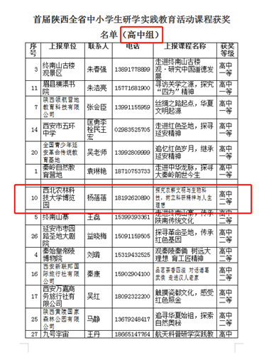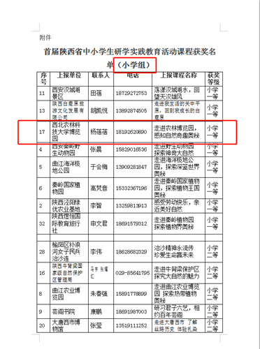近日,由陕西省教育学会主办的首届陕西省中小学生研学实践教育活动课程评选结果公示,西北农林科技大学博览园2项课程在65家单位99篇研学实践教育活动课程中脱颖而出,分别荣获小学组一等奖和高中组二等奖。