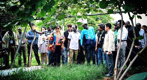 在位于眉县横渠镇青化村的西北农林科技大学猕猴桃试验示范站,留学生们兴趣盎然,了解由学校专家教授+地方农业技术干部+职业农民+果农的“田间最后一公里”校地联合农技推广模式,了解猕猴桃试验站在建园管理、病虫害防治、科学施肥、储藏加工等环节的技术。驻站的猕猴桃专家杨开宝教授忙着回答留学生们的问题,“你们现在品尝的‘农大金猕’是西北农林科技大学培育的新品种,属于中华猕猴桃,生长在秦岭以北,营养丰富、口感香甜,具有多种保健功效。”