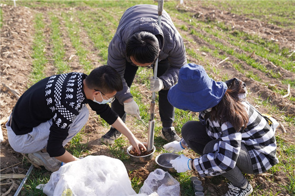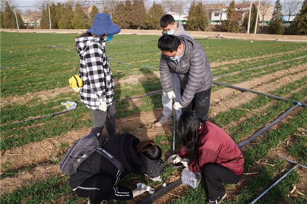 在田间,研究生们对于小麦群体和个体发育情况进行调查,采集2米土层的土壤样品,准备带回学校测定土壤含水量,以便为当地小麦春季管理提供更为精准的信息。
