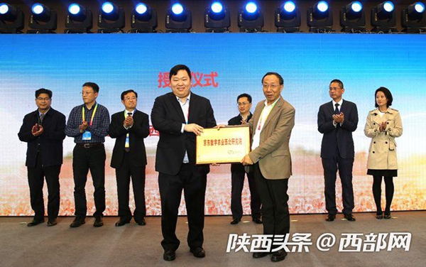 京东集团副总裁、X事业部总裁肖军向西北农林科技大学校长助理霍学喜教授颁发京东数字农业西北研究院牌匾