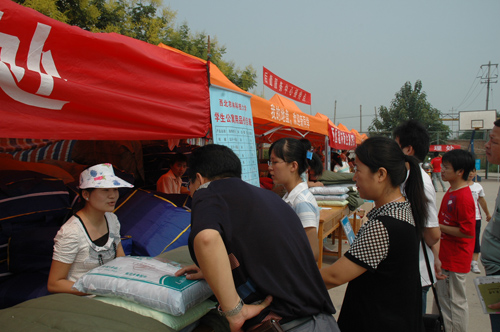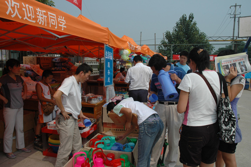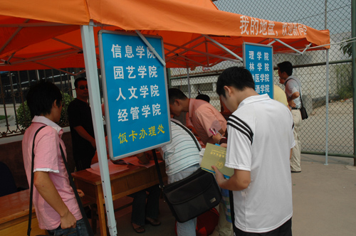 在北校区篮球场,后勤服务中心想新生之所想,急新生之所急,紧随院系接待注册点设立了新生接待点,给学生提供办理饭卡、购买生活用品,开通宿舍电话等方便周到的服务,使新生踏实、顺利地开始大学生活。