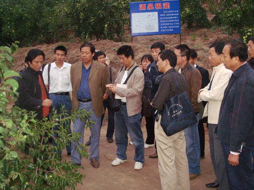 米脂孟岔红枣节水灌溉基地针对榆林南部丘陵沟壑地区水土流失、干旱缺水现状,在国家、省、市及学校推广项目“榆林山地红枣微灌技术集成与示范”的支撑下,与地方政府、科技部门、红枣种植大户结合,充分就地利用雨水资源,将节水灌溉技术成功应用于山地红枣上,提高了有限水资源利用效率,达到红枣增产目标。参观学习过程中,各位专家对节水灌溉基地采用的“毛管布置技术”、“重力式施肥技术”等先进实用技术产生了浓厚兴趣,就节水灌溉利用的工程造价、后期管理等问题和米脂基地负责人汪有科研究员等进行了深入探讨,并与基地科研人员互留联系方式,期望日后该基地所采用的先进技术能在其它试验站“开花结果”。米脂县银州镇孟岔村红枣种植大户孟浩海还向大家介绍了自己利用学校节水灌溉技术后,红枣品质、效益都有显著提高的感受。