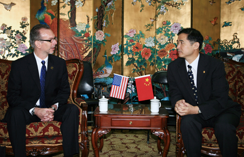 应我校邀请,美国北卡罗来纳大学彭布洛克校区(UNCP)负责国际项目的副校长James Callaghan博士于9月16日—18日来我校访问。9月17日上午,侯曦副校长在国际交流中心贵宾室会见了Callaghan博士。双方就已开展的本科生2+2和1+2+1留学项目进行了协商,在项目申请条件、学位授予等方面互换意见,并就开展本硕连读的可能性进行了探讨。国际合作与交流处、教务处、经管学院、生命学院、外语系等相关部门负责人参加了会见。