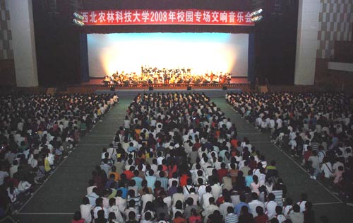 为了促进我校大学生素质的全面提高,进一步推进高雅艺术进校园活动,9月20日晚,我校在体育馆举行了2008年校园专场交响音乐会,西安音乐学院交响乐团为我校5000多新生呈现了一场精彩的音乐盛会。