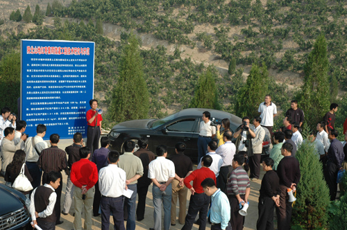 观摩会上,与会人员现场参观了设在米脂县银洲镇孟岔村山地红枣节水灌溉示范基地,听取了我校节水灌溉专家的介绍,大家对我校项目组所取得的研究成果给予高度评价。 看着漫山遍野绿油油的枣林和繁盛的硕果,所有参观者的心都被震撼了。陕西省科技厅厅长张炜在观摩会上安排部署了全省因地制宜学习借鉴孟岔基地经验工作,他说,山地红枣节水示范开辟了科技服务“三农”的有效途径,形成了校地合作的有效模式。榆林市副市长兰新哲说,一个孟岔将带动很多孟岔,一个红枣将带动很多产业。孙武学校长说,这是我校科研工作者将论文写在了黄土大地上,并表示要在孟岔建立山地红枣节水灌溉试验示范站,通过培训指导科技大户,借助符合集约化要求的土地流转机制,推广农业科技,以星星之火形成陕西黄土高原经济作物产业进一步发展的燎原之势。