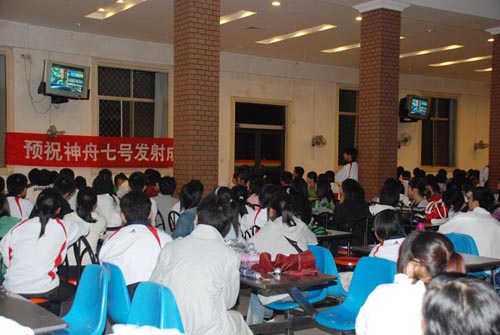 9月26日晚9时10分许,当我国“神舟七号”载人飞船由“长征二号F”运载火箭发射升空的那一瞬间,我校校园里顿时响起了响亮的欢呼声,无数大学生围坐在食堂、超市等处的电视机旁,宿舍的电脑旁,关注着这激动人心的一刻。
