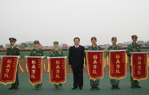 常务副校长赵忠为获得军训标兵方队的连队颁奖并与他们合影