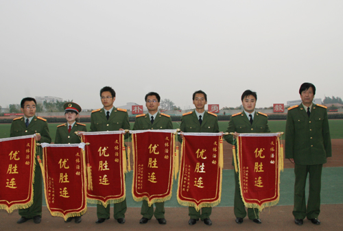 94028部队副政委王新宇为获得军事训练优胜的连队颁奖并与他们合影