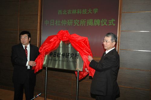 吴普特副校长和日本造船产品研发中心常务董事古寺雅晴先生为中日杜仲研究所正式揭牌