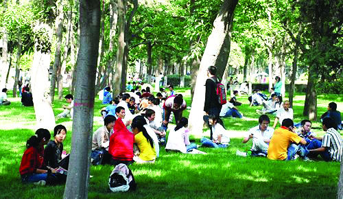 疏散到安全地带的学生在看书、聊天