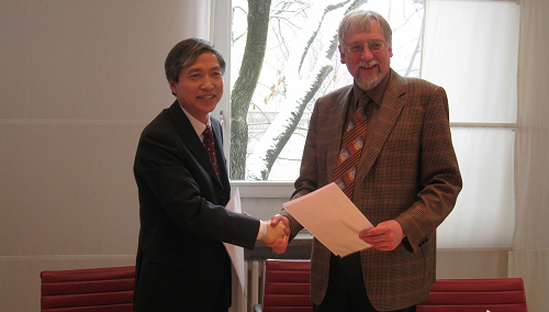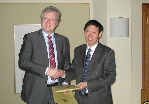 2月11日,代表团来到弗莱堡大学,该校是德国9所精英大学之一,具有450年历史,产生了5位诺贝尔奖获得者。上午与弗莱堡大学林学院院长Heize Rennenberg教授、副院长Gero Beckerj教授及6位专家进行了座谈,商谈科研合作项目和欧洲环境管理硕士项目、欧洲森林生态与管理硕士项目。中午,弗莱堡大学副校长Juergen Ruehe教授、国际交流中心主任Christian Tischer会见了考察团,就双方在多个领域的合作及林学领域的进一步合作进行商讨。下午,孙校长和弗莱堡大学校长Hans-Jochen Schiewer教授进行商谈并正式签署了校际合作协议。代表团还约见了该校中国留学生联合会主席田晓辉,希望通过当地留学生组织积极宣传我校及我校的人才引进工作。目前已有一对研究脑神经的留学生夫妇表达了来校意愿。