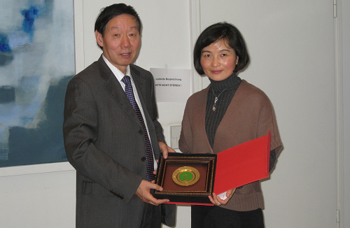 孙校长向慕尼黑技术大学Liqiu Meng副校长赠送校徽
