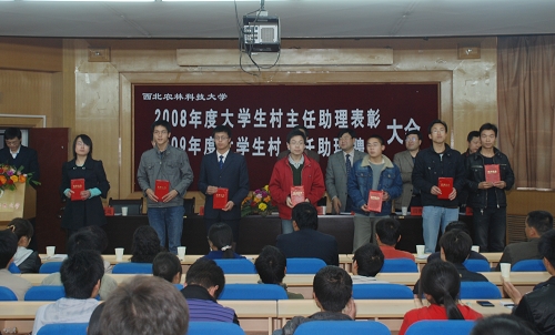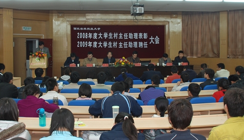 在全校上下开展深入学习实践科学发展观活动之际,我校于4月2日在北校区七号楼二层报告厅召开了2008年度大学生村主任助理表彰暨2009年度大学生村主任助理聘任大会。校党委副书记徐养福,杨凌区委副书记任博,驻杨凌区团委团省委挂职干部杨晓军同志出席了大会,校团委、学生处、党委宣传部等相关部门负责同志、杨凌区相关部门负责同志及大学生村主任助理200余人参加了会议。