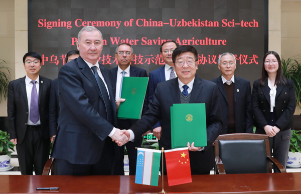 会后,双方在交流中心二楼大厅举行了“中乌节水农业技术科技示范园建设协议”签署仪式。代表团还参观了农业推广展和旱区节水农业研究院。