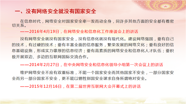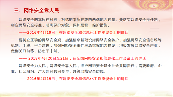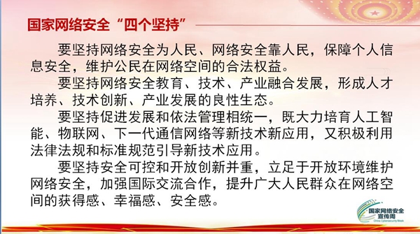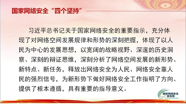 编者按 2019年9月16日至22日是第六届国家网络安全宣传周。9月16日,习近平总书记对国家网络安全宣传周作出重要指示,提出了国家网络安全“四个坚持”的原则要求。10月18日,教育部科技司就学习贯彻习近平总书记重要指示精神专门下发通知,要求充分认识习近平总书记重要指示的重大意义,认真组织学习传达、全面落实习近平总书记重要指示精神。