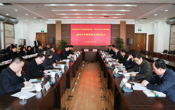 2月29日下午,我校西部发展研究院与西北大学公共行政研究院签订战略合作协议。第十一届全国政协副主席、我校西部发展研究院院长陈宗兴,陕西省十届人大常委会副主任、陕西省决策咨询委员会副主任、西北大学公共行政研究院院长邓理,中国生态文明研究与促进会会长助理王春益研究员,陕西省政协副秘书长马鹏程,杨凌示范区管委会副主任刘天雄,西北大学校长郭立宏,我校党委书记李兴旺、校长孙其信、副校长钱永华及西部发展研究院成员,我校科研院、经管学院、人文学院、西北大学有关部门和公共管理学院的负责同志、专家学者参加签约仪式。李兴旺主持签约仪式。