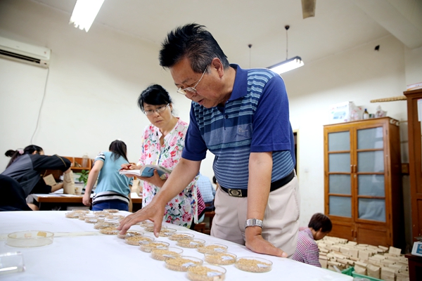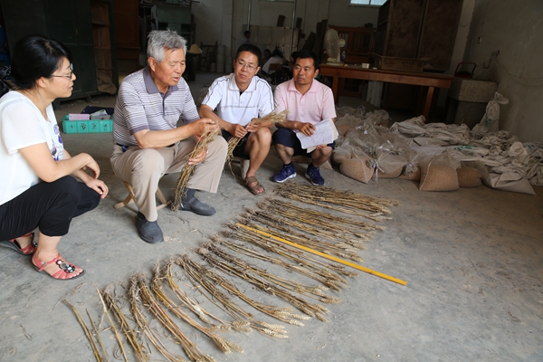 2016年6月30日,王辉教授和助手们在室内对小麦进行进一步决选
