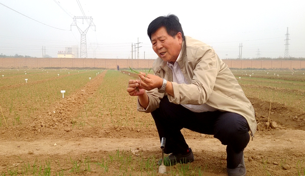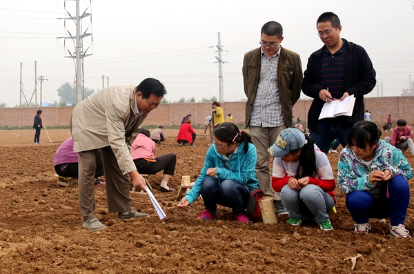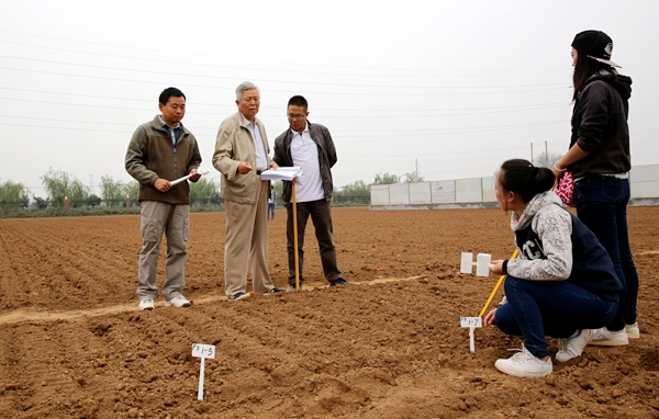 2015年10月20日王辉教授在试验田里查看小麦出苗情况