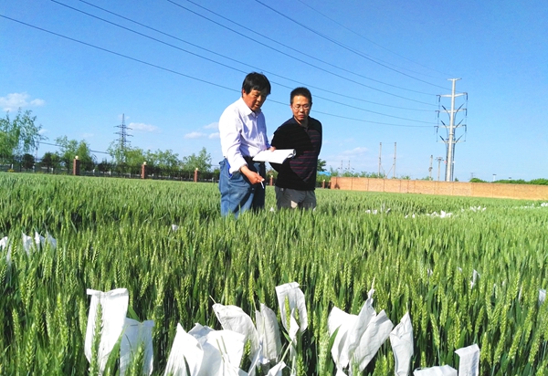 2016年4月27日王辉教授和青年育种工作者冯毅老师正在试验田里查看小麦授粉杂交情况