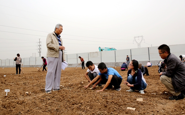 2015年10月20日王辉教授与团队助手在查看小麦发苗情况