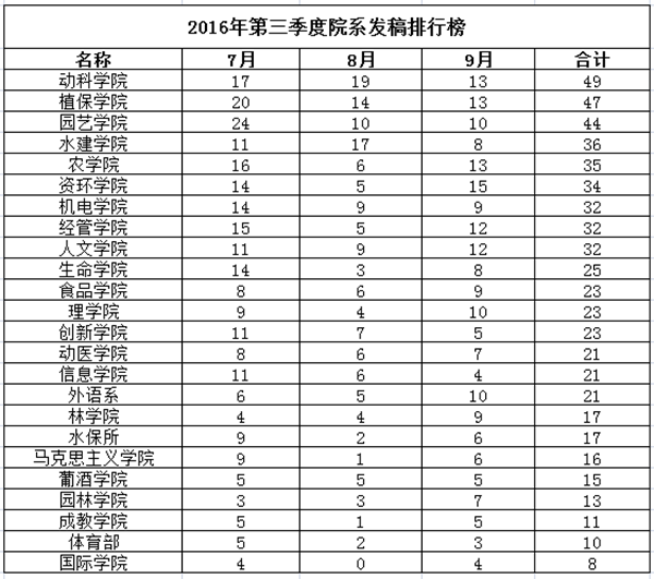 2016年第三季度各单位网络新闻排行榜