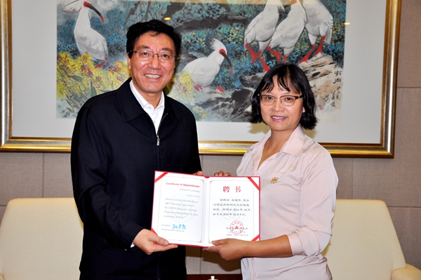 孙其信校长会见了代表团一行。他表示,我校与加州大学戴维斯分校已经建立了长期、稳定、紧密的合作伙伴关系,双方在我校80周年校庆期间联合举办了“中国西部发展与生态文明建设国际论坛”,并合作建立了中美食品安全联合研究中心。未来两校将以此为契机和平台,继续开展深入合作。孙其信校长还向梁临霞博士颁发了“客座教授”证书。