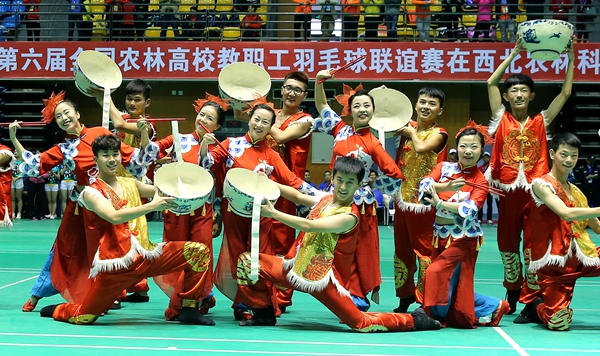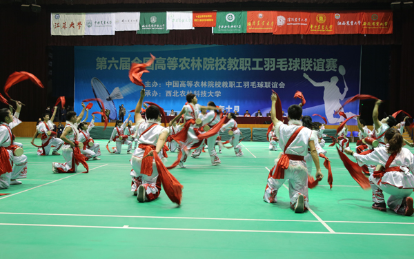 开幕式上,我校大学生艺术团和教职工艺术团先后表演了腰鼓《追喜》、舞蹈《biangbiang面》、啦啦操《舞动奇迹》。之后,江西农业大学校长黄路生宣布,第六届全国高等农林院校教职工羽毛球联谊赛正式开幕。