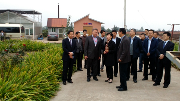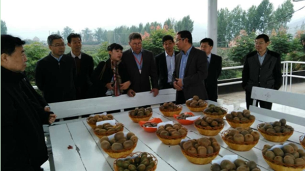 首席专家刘占德研究员向客人详细介绍了猕猴桃产业发展、果农增收、校县合作、科研和科技成果推广情况,陪同参观了苗木繁育试验、扦插嫁接试验、新品种展示和规范化栽培新技术示范区。德克•德鲁品尝了试验站选育的脐红和袖珍香猕猴桃后,赞不绝口。随后实地考察了猕猴桃试验站指导的金渠镇田家寨猕猴桃示范基地。