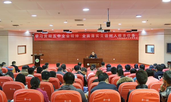 10月27日上午,著名专家田建国教授莅临我校,为我校全体学生干部、2016级学生代表作题为《学习贯彻五中全会精神 全面落实立德树人根本任务》的专题报告,报告会由校党委副书记吕卫东主持。