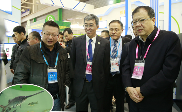 陕西省科技厅厅长卢建军听取我校专家吉红教授关于匙吻鲟的养殖情况 (支勇平 摄影)