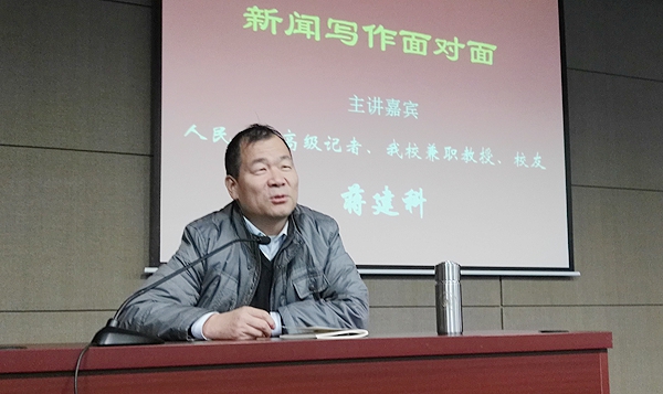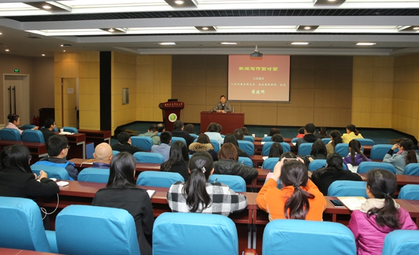 讲座中,蒋建科老师改变了传统的上面讲,下面听的培训形式,而是针对现场师生提出的问题,结合大量鲜活、生动的事例,举一反三,为大家作讲解。他指出,解决新闻与宣传之间的矛盾,要寻找新闻价值与宣传价值的结合点,在宣传中找新闻点,在新闻中找有效点,提炼重点,突破标题,然后寻找合适的窗口,合适的时机,把宣传变成新闻。他为大家分享了自己在实际工作中总结出的寻找新闻点的方法——“中心工作法”和“杂交组合法”,勉励师生们要抓住中央、省委、学校的近期中心工作,掌握事件共点、亮点,梳理思路,总结要点,写出有思想、有价值的新闻报道。