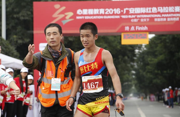 周金华在2016广安国际马拉松大赛中冲向终点