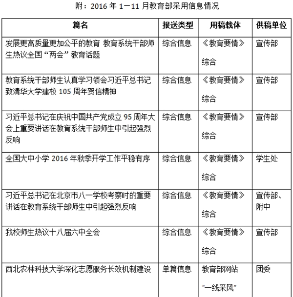 近年来,学校高度重视信息工作,出台《信息报送管理办法(试行)》,设立信息工作专项经费,健全信息员队伍,并经常举办办公室实务专题培训班,不断强化信息意识,着力加强信息综合分析与应用能力建设,信息工作的质量和水平得到稳步提升:今年1—11月份我校通过信息平台向教育部报送信息120余条,其中16篇被教育部相关信息载体采用,包括通过《教育要情》(综合)向中办国办报送6篇、《教育部简报》综合采用1篇、教育部网站“一线采风”单篇采用9篇,信息工作综合排名位居教育部直属高校前列、陕西高校第三。同时,还向省教育厅报送信息310余条,被采用210余篇,其中调研类和经验总结类信息占1/3以上,微博、视频类占1/3,信息质量系数位居全省高校第一,信息采用积分在全省高校中排名第五。同时,编印学校《信息通报》61期,及时汇集高等教育热点问题和学校重大工作进展情况,获得一致好评。