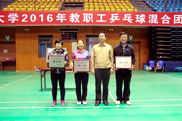 11月24日—28日,2016年教职工乒乓球混合团体比赛在南校区体育馆举行。经过两个阶段共计72场激烈角逐,最终机关代表队蝉联冠军,后勤中心代表队获亚军,农学院代表队获得第三名,资环学院代表队、体育部代表队、机电学院代表队、生命学院代表队和动科学院代表队分获第四名至第八名。